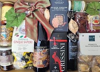 Geschenkbox Bella Notte La bella vita italiana - das italienische dolce vita als Geschenk verpackt… Tolle Geschenkbox mit Rotwein aus Venetien Grissini Balsamico Essig Cracker italienische Pasta eingelegte Balsamico Zwiebeln Oliven mit Mandeln Bruschetta Tomatensauce Pesto getrocknete Tomaten zarte köstliche Amarettini Gewürzmühle