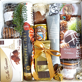 Geschenkbox Weihnachtstag Elegante weiße quadratische Geschenk-Box randvoll gefüllt mit wunderbaren Köstlichkeiten, um die Zeit um Weihnachten zu verschönern: Vulcano Trüffel Filet Oliven gefüllt mit Mandeln tolle Balsamico Zwiebeln Weihnachtspastete mit Apfel und Zimt Weihnachtsmarmelade würzige Nüsse mit mediterranen Gewürzen Lebkuchen Maroni Pralinen Schokoladen Trüffel Weihnachtstee mit Zimt und Rosenblüten und einem wunderschönen eleganten Geschirrtuch aus einer Vorarlberger Weberei. garantiert Weihnachtsfreude und Genussmomente Wählen Sie zwischen der klassischen Box ohne Alkohol und dem Geschenk mit zusätzlich Prosecco oder Rotwein