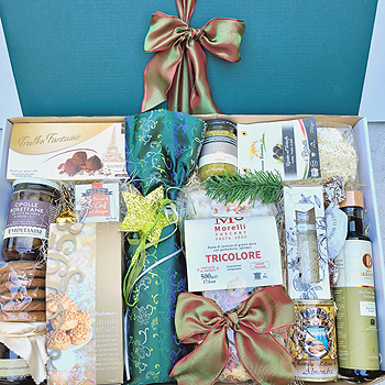 Weihnachtsgaben Geschenkbox voller herrlicher Weihnachtsgaben: Geschenkbox grün Prosecco oder Rot- oder Weisswein verpackt in einem dekorativen Stoffbeutel dekoriert mit einem grünen Stern Weihnachtspasta tricolore aus Italien toller Balsamico aus Sizilien Trüffelrisotto Oliven mit Mandeln Wildpasgtete Salz mit Yuzu köstliches Trüffelpesto Käsecracker Balsamico Zwiebeln Lebkuchen Weihnachtsmarmelade und Schokoladentrüffel Himmlischer Weihnachtsgenuss WICHTIGE INFOS - BITTE LESEN: Die Dekorationen am Foto sind Vorschläge - wir passen unsere Dekoration selbstverständlich der Jahreszeit und dem Anlass an. Wenn ein Artikel im Geschenk nicht lieferbar- oder ausverkauft ist, wird dieser durch ein gleich- bzw. höherwertiges Produkt ersetzt und wir arrangieren jedes Geschenk mit viel Liebe zum Detail. BITTE BESTELLEN SIE NUR, WENN SIE DAMIT EINVERSTANDEN SIND. Sie erreichen uns jederzeit gerne auch gerne telefonisch unter 0043/ 699/ 140 150 35!