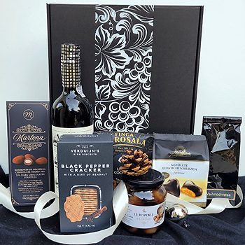 Geschenkbox Black White Weihnachtsedition Elegantes Geschenk in schwarz weiss Tönen mit Rotwein Fabelhaft/ Portugal Pfeffer Cracker Balsamico Zwiebeln Weihnachtstee Lebkuchenherzen Nüssen Schokomandeln