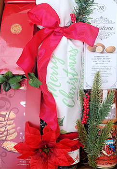 Geschenkbox Weihnachtsgrüße Hübsche Geschenkbox in Rottönen mit Ihren Weihnachtsgrüßen Rotwein Appassimento Venetien Käsegebäck Weihnachtsmarmelade Oliven Weihnachtssalz schokolierte Mandeln Weihnachtstee Winterzauber Küchentuch Merry Christmas. Weihnachtlich dekoriert