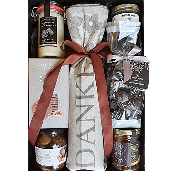 Geschenkbox Danke elegant Wunderbare Komposition erlesener Produkte um Ihrer Dankbarkeit Ausdruck zu verleihen. Geschenkbox schwarz Rotwein aus Venetien, Rotwein aus Spanien oder Prosecco verpackt in einem tollen Geschirrtuch von Übelöhr aus Vorarlberg mit Aufschrift DANKE Olivencreme aus Frankreich Balsamico Zwiebeln Trüffel Mayonnaise aus Belgien toller Nuss-Mix wunderbare Erdnuss-Kekse himmlische Schokoladentrüffel aus dem Piemont Geschirrtücher: silbergrau, Aufschrift Danke (eingewebt) drei mögliche Danke - Motive bitte wählen Sie zwischen 2 Sorten Rotwein und Prosecco