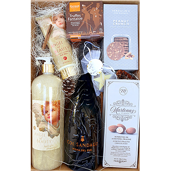 Geschenkbox Wellness Engel Himmlische Geschenkidee mit Engel Schaumbad, Engel Body Lotion, tollem Prosecco, wunderbaren schokolierten Mandeln, köstlichen Keksen und französischen Süßigkeiten dekoriert mit einer hübschen Weihnachtsseife mit Weihnachts Button...