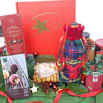 Geschenkbox Weihnachtstraum stilvolle Geschenbox in rot mit einem goldenen Stern als festliche Verpackung für wunderbare Weihnachts-Freuden: Prosecco oder Rotwein im dekorativen Stoffbeutel wunderbares Käsegebäck Pistazien aus dem Iran Peppersweet - eingelegte Mini Paprika mit Frischkäse gefüllt heiße Schokolade Weihnachtsmarmelade aus Frankreich Frucht und Sinne Schokolade Pralinen Mandeln in Schokolade getaucht Cranberry Kekse Bitte wählen Sie zwischen Prosecco und Rotwein