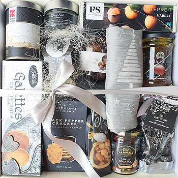 Elegante Weihnachten Elegantes Weihnachtsgeschenk mit erlesenen Köstlichkeiten - erhältlich mit- und ohne Alkohol Geschenkbox weiß mit silberner Schleife Wildsalami aus Spanien Cracker mit Pfeffer Gourmet Nuss Mix Pflaumen mit Frischkäse gefüllt schwarzes Salz aus Hawaii Zwiebeln in Balsamico Espresso Nüsse mit Honig Schokoladentrüffel aus dem Piemont Frucht und Sinne Marillen mit Schokolade und ein wunderschönes Geschirrtuch mit Weihnachtsmotiven aus einer Vorarlberger Manufaktur als elegantes Highlight dieses stilvollen Geschenks. Bitte wählen Sie aus mehreren Varianten!