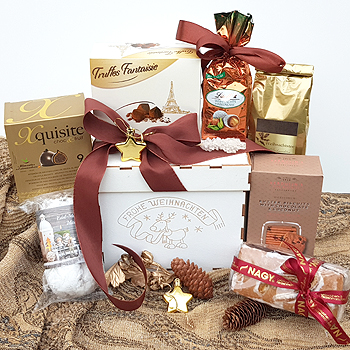 Geschenkbox Elch Hübsche Holzbox mit Elchmotiv und Aufschrift Frohe Weihnachten gefüllt mit exklusiven und wunderbaren Weihnachts-Naschereien: Holzbox Elch Christstollen Schokolade von Frucht und Sinne Schokoladenkekse köstliche Florentiner Schokoladentrüffel toller Lebkuchen aus Salbzurg Lindt Weihnachtsmandeln Weihnachtstee mit Zimt und Rosenblüten hübsche Weihnachtsdeko und Schleife