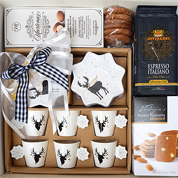 Wunderschönes Espresso Set bestehend aus 6 Espresso Tassen mit Hirsch-Motiv und Schneeflocke dazu toller italienischer Espresso und als süße Begleitung: köstliche Mandel Kekse Nüsse mit Schokoladen Mantel und Lebkuchentaler