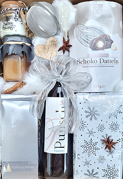 Geschenkbox Silberglanz Weihnachtlich- elegante Geschenkbox mit erlesenen Süßigkeiten und Punsch. Weihnachtlicher Punsch ohne chemische Zusätze aus NÖ französische Schokoladentrüffel Mandelkekse wunderbarer Lebkuchen aus Salzburg Schokolenfondue im Glas Weihnachtstee mit Rosenblüten und Zimt Teesieb Weihnachts-Stollen köstliche Weihnachtsmarmelade Weihnachtsdeko