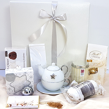 Geschenkbox Tea Time Elegante weiße Geschenkbox gefüllt mit wunderbarer Weihnachtsfreude incl. einer entzückendem Teekanne/ Tasse. Geschenkbox weiß Teetasse/ Kanne Weihnachtstee weiße heiße Schokolade Kandis Weihnachtsschokolade Schokoladentrüffel Lindor Kugeln Christ Stollen Schokolaentrüffel/ Frankreich Weihnachtsseife