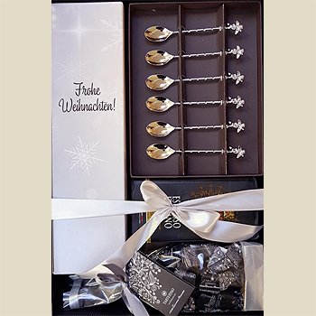 Geschenkbox Engel Toller österreichischer Sekt geschenkverpackt, Espresso, herrliche Schoko Trüffel aus dem Piemont und als Highlight die entzückenden Löffel mit Engerln, die jedes Weihnachten verzaubern. Bezaubernd, köstlich und himmlisch in jedem Sinn.