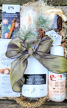 Geschenk Wintergefühl bezauberndes Geschenkkörbchen mit einem Potopourri an Weihnachtsfreuden Prosecco Millesimato Weihnachtsmarmelade Weihnachts Stollen Marlonas, Mandeln im Schokoladenmantel Weihnachtsschokolade Schaumbad Wintergefühl