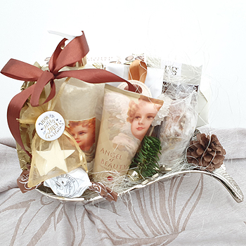 Geschenk Engelflügel Auf Engelschwingen gebettet flattern himmlische Geschenke ins Haus die viel Freude, Genuss und Entspannung bringen. Silberfarbene Schale Engelflügel Schaumbad Engel Bodylotion Engel Seife in Organza Sackerl wunderbarer Kuchen aus der Provence Herrliche Schokolade aus Frankreich Weihnachtstee Christstollen Kandisstick Schokolade von Frucht und Sinne. Ein wahrhaft himmlisches Vergnügen...