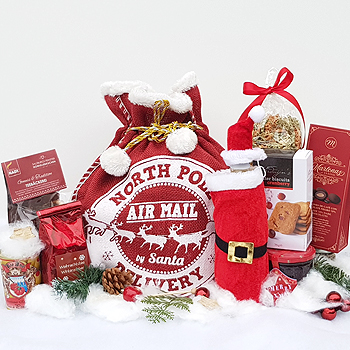 Geschenk Nordpol Hübscher Jutesack mit Aufschrift, Pelzbesatz und süßen Pommeln gefüllt mit Köstlichkeiten rund um Weihnachten: Punsch (ohne chem Zusätze) im Santa Claus Kostüm : ) Weihnachtspasta bunt Steinpilzsugo Oliven Weihnachtsmarmelade Nüsse im Schokoladenmantel Cranberrykekse Lebkuchen aus Salzburg Weihnachtstee hübsche Weihnachtsdekoration