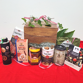 Geschenkbox Holzschatz Österreichische Köstlichkeiten verpackt in einer tollen Kartonbox in Holzoptik. Steirisches Kernöl in einer eleganten Dose Vulcano Salami mit Walnüssen eingelgte getrocknete Tomaten von Frey Vulcano Schinken Chips Staud's Silberzwiebeln knusprige Alpenbrezel Sonnentor Kekse Apfelstrudel schokolierte Früchte von Frucht und Sinne. hübsche Deko und rustikale rot-weiß-rote Schleife