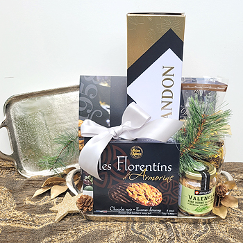 Geschenk Festlicher Champagner Wunderschönes Tablett aus Metall silberfarben (sehr edel und schwer) bestückt mit einer Flasche Moet & Chandon tollem Käsegebäck Grissini wunderbare Schokoladentrüffel von einem Chocolatier aus dem Piemont köstlichen Florentinern und Nüssen mit Kräutern aus Spanien. edel dekoriert, verpackt in Zellophan mit einer schönen Schleife ist dies ein wunderbares Geschen zum Anstoßen, Feiern und genießen