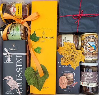 Geschenkbox Champagner Momente Elegante Geschenkbox mit Champagner und erlesenen Köstlichkeiten als stilvoller und edler Gruß oder Glückwunsch Veuve Clicquot Champagner Grissini tolle Mandeln mit mediterranen Kräutern Oliven Balscamico Zwiebeln Pastete mit Trüffeln getrocknete Tomaten Cracker Schokoladetrüffeln elegant dekoriert mit Schleife