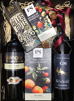 Geschenkbox Geburtstagswein Österreichischer Wein und Schokolade perfekt geeignet um den Geburtstag zu feiern und zu genießen. Rotwein Blaufränkisch Keringer Schwarz Gelber Muskateller Fruchtpralinen Schokolierte Früchte und Geburtstagsschokolade (alle von Frucht und Sinne OÖ) hübsch dekoriert und Schleife Happy Birthday und Zum Wohl!